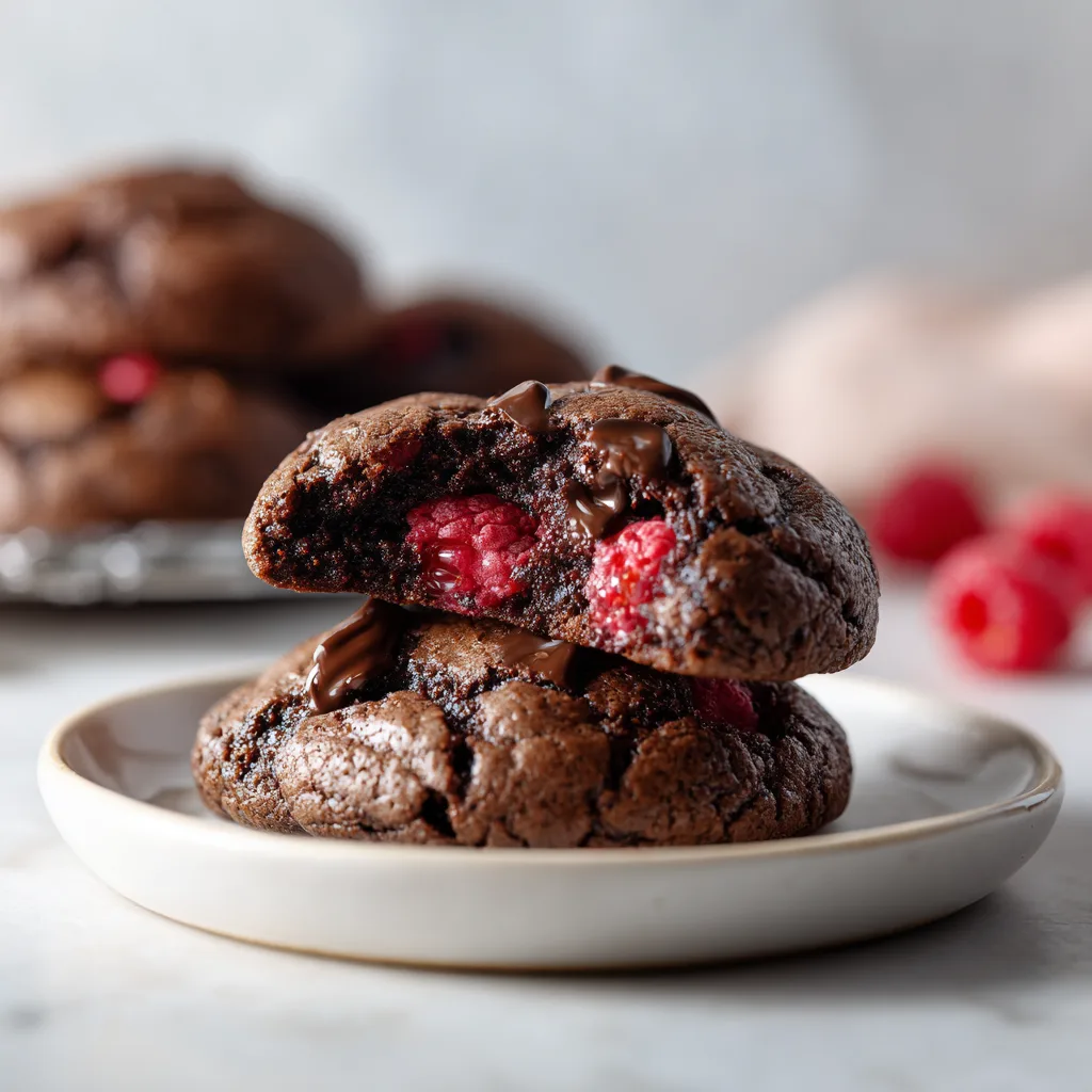 These cookies are intensely fudgy, closer to a brownie than a traditional cookie. The centers stay soft and rich, while the edges develop just enough structure to hold everything together. Raspberries melt slightly into the dough, creating jammy pockets of brightness that cut through the richness of the chocolate.