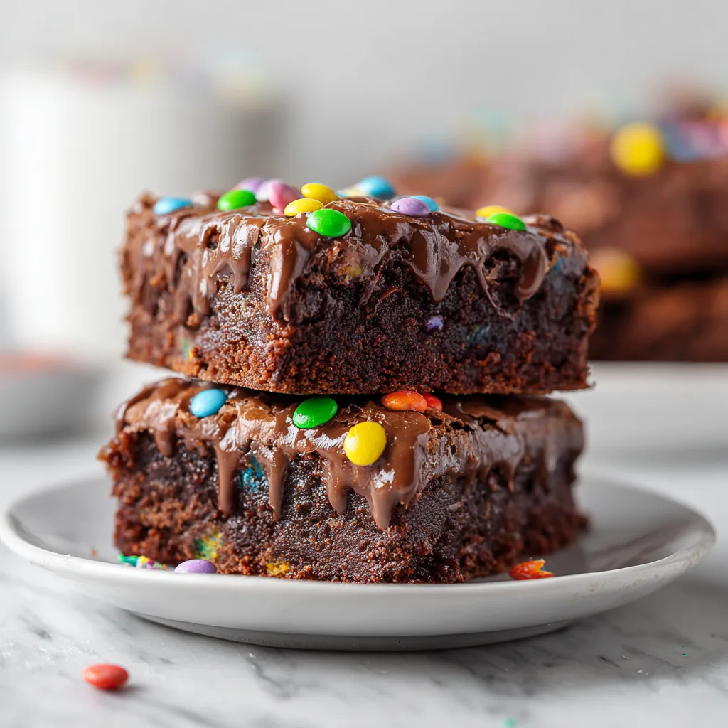 Ultra-fudgy chocolate brownies topped with silky ganache and colorful candy-coated chips for a nostalgic yet elevated dessert.