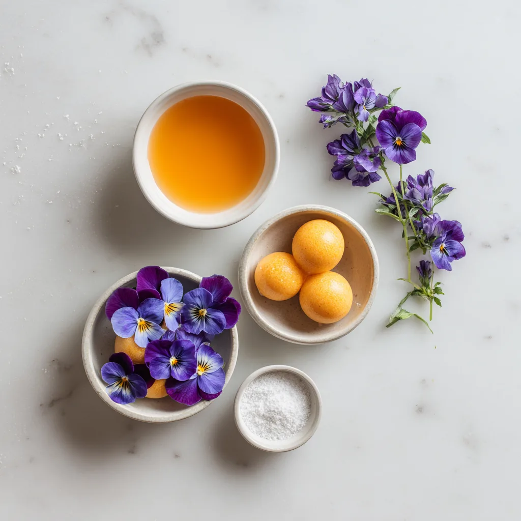 Arrange the spheres in a shallow dish or spoon. Garnish with viola flowers, citrus zest, and optional mint leaves.