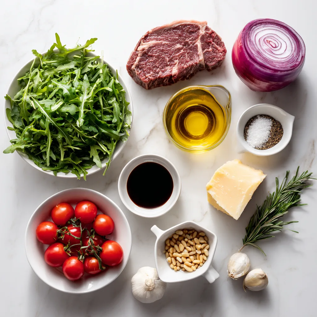 Arrange sliced steak over the arugula mixture. Sprinkle with shaved Parmesan and toasted pine nuts. - Dress and serve.
