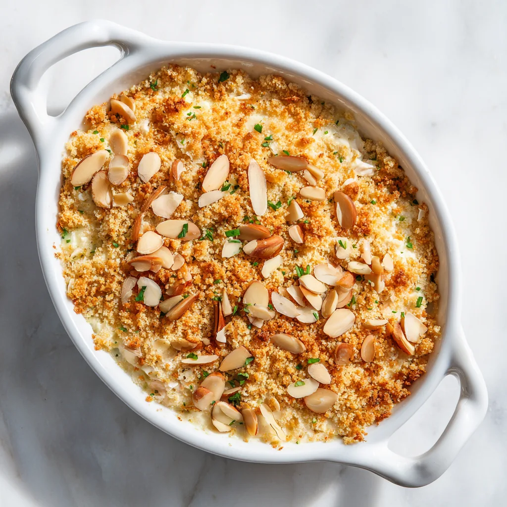 In a small bowl, mix breadcrumbs (or crushed chips) with melted butter and sliced almonds. Sprinkle this mixture evenly over the top of the casserole.