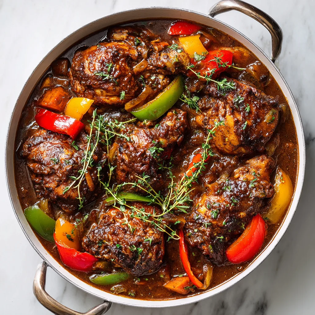 A rich and flavorful Caribbean chicken stew simmered in a savory brown gravy with herbs, spices, and vegetables.