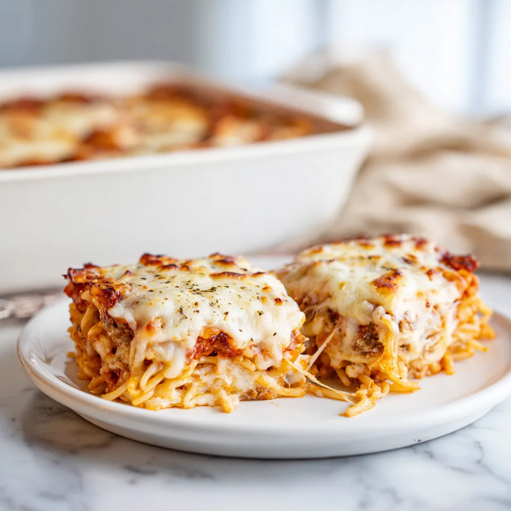 A spaghetti pizza bake is essentially a baked pasta casserole where cooked spaghetti is combined with eggs and cheese to form a crust-like base, then topped with pizza sauce, mozzarella, and your favorite pizza toppings. Once baked, it slices beautifully—almost like a pizza pie—but with a rich, pasta-filled twist.