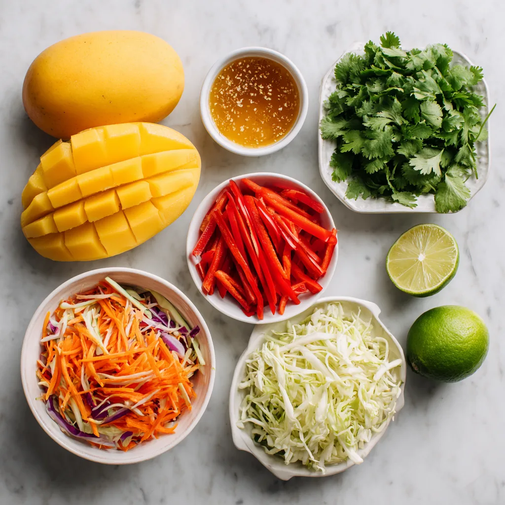 - Combine shredded cabbage, carrots, bell pepper, mangoes, cilantro, and green onions in a large bowl.
