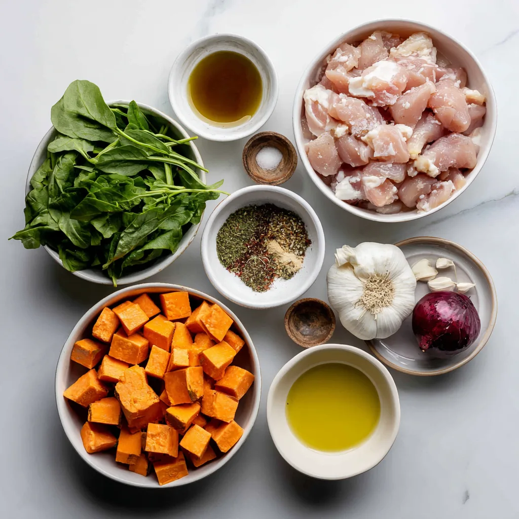 While the sweet potatoes are roasting, heat a skillet over medium heat. Add a drizzle of olive oil and cook the marinated chicken for about 5–7 minutes per side, depending on thickness.