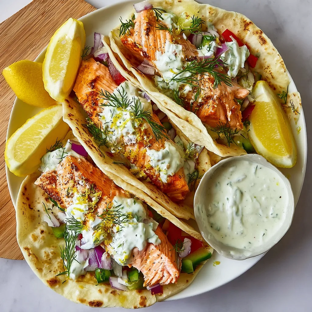 If you love tacos but want something vibrant, refreshing, and a little more nourishing, Mediterranean-Style Salmon Tacos are the recipe you didn’t know you needed. This fusion dish takes the bold, zesty, herby flavors of Mediterranean cuisine and wraps them in the warm, familiar embrace of a soft taco. It’s the perfect marriage between light, flaky salmon and bright, crisp toppings like cucumber, tomatoes, red onion, and lemon — all finished with a cool, garlicky tzatziki that ties everything together.