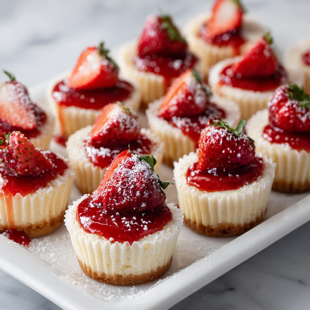 These miniature cheesecakes deliver the same luxurious flavor as a traditional cheesecake but in a convenient, individual portion. The texture is smooth and rich, the crust adds a satisfying crunch, and the strawberries provide a fresh burst of sweetness that balances everything beautifully.