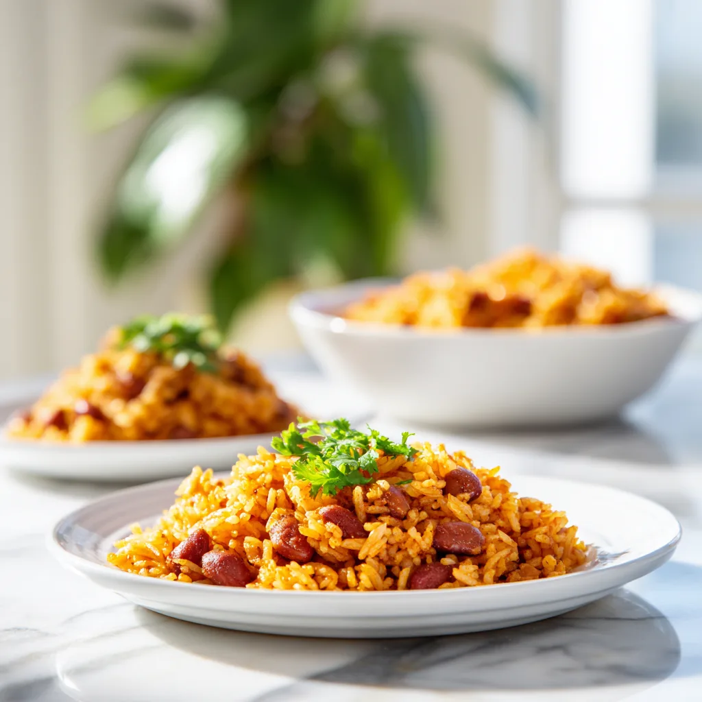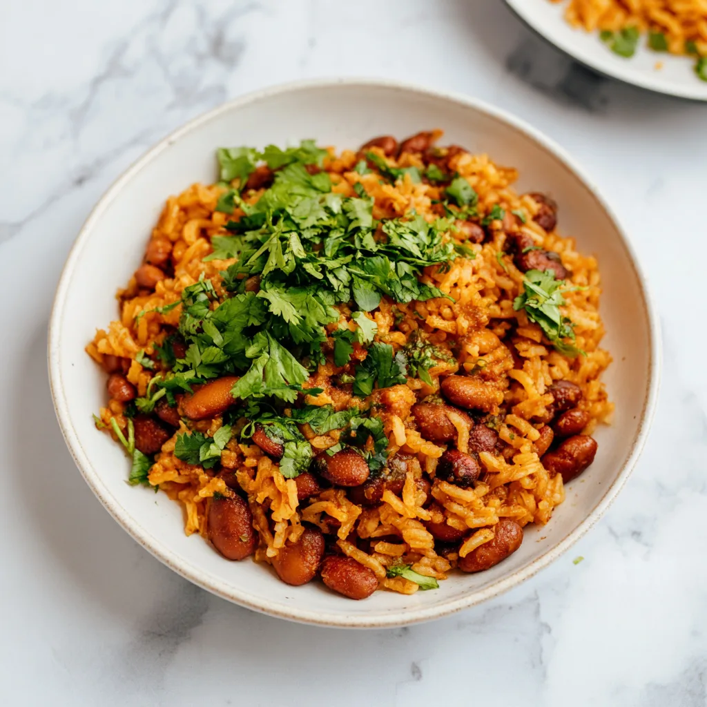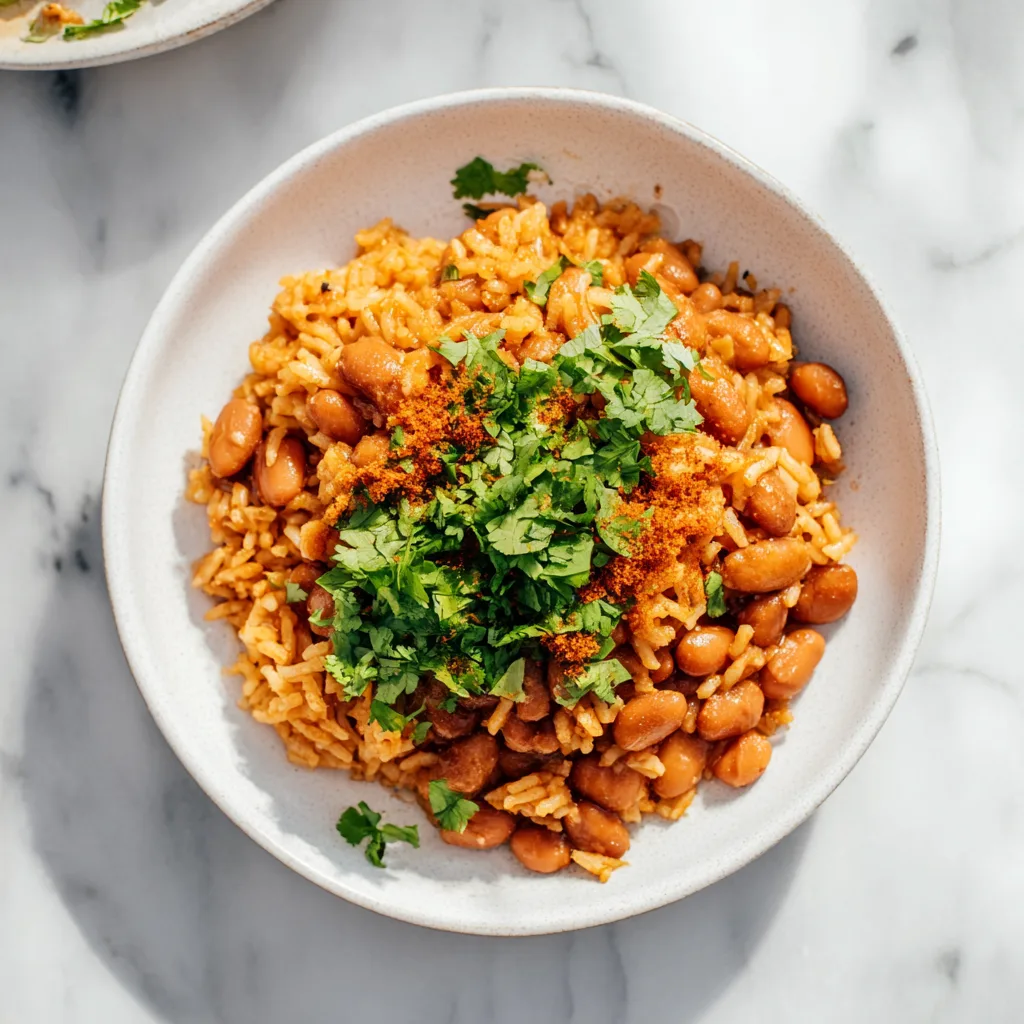 A comforting, deeply seasoned plate of soft rice and saucy, flavorful beans that fills the kitchen with the aroma of home.