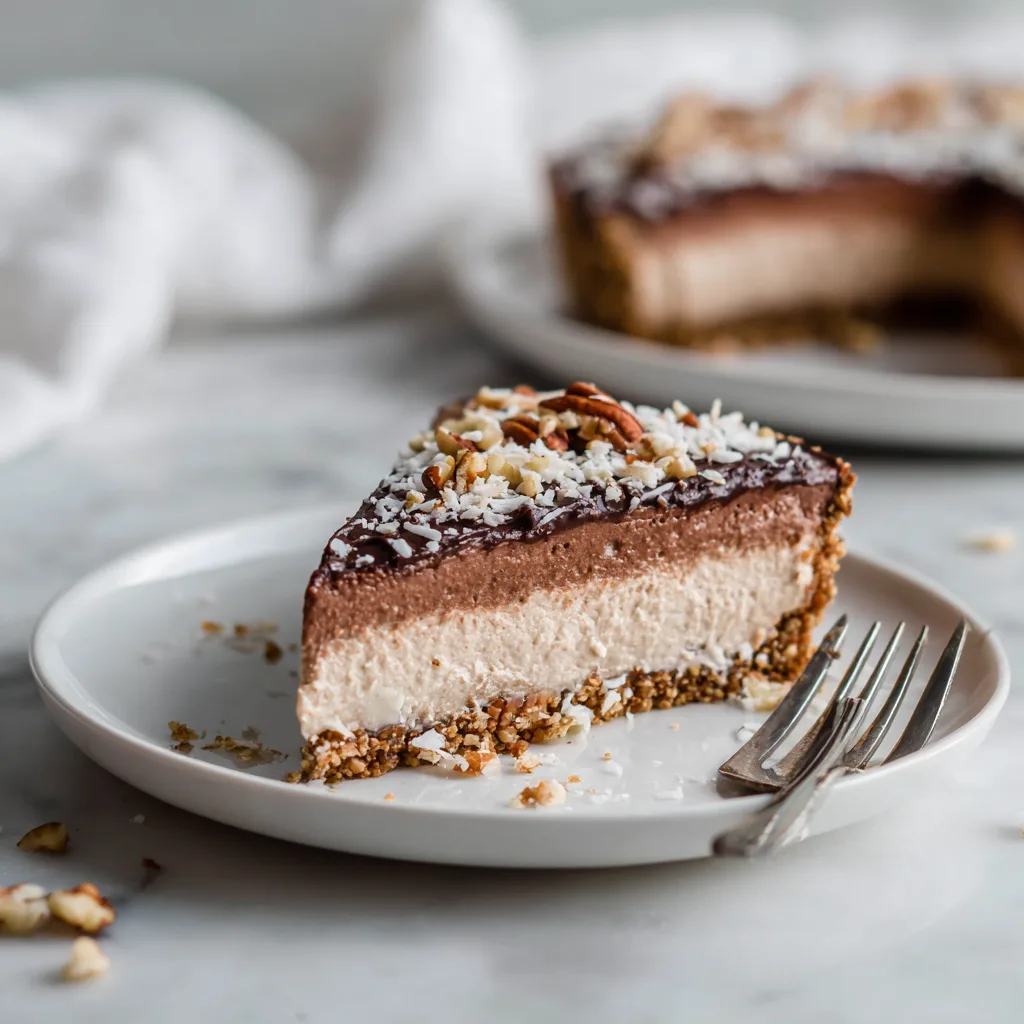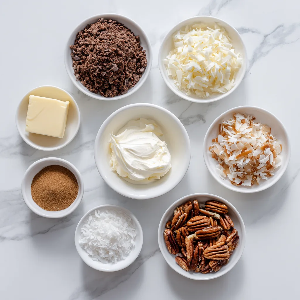 What truly sets this recipe apart is its balance of textures and flavors. A chocolate cookie crust forms the foundation—slightly crisp, deeply cocoa-forward, and sturdy enough to support the filling. The center is a creamy chocolate layer that’s light yet rich, thanks to cream cheese and whipped topping. Finally, the crowning glory: a gooey coconut-pecan topping that delivers sweetness, crunch, and nostalgic comfort in every bite.