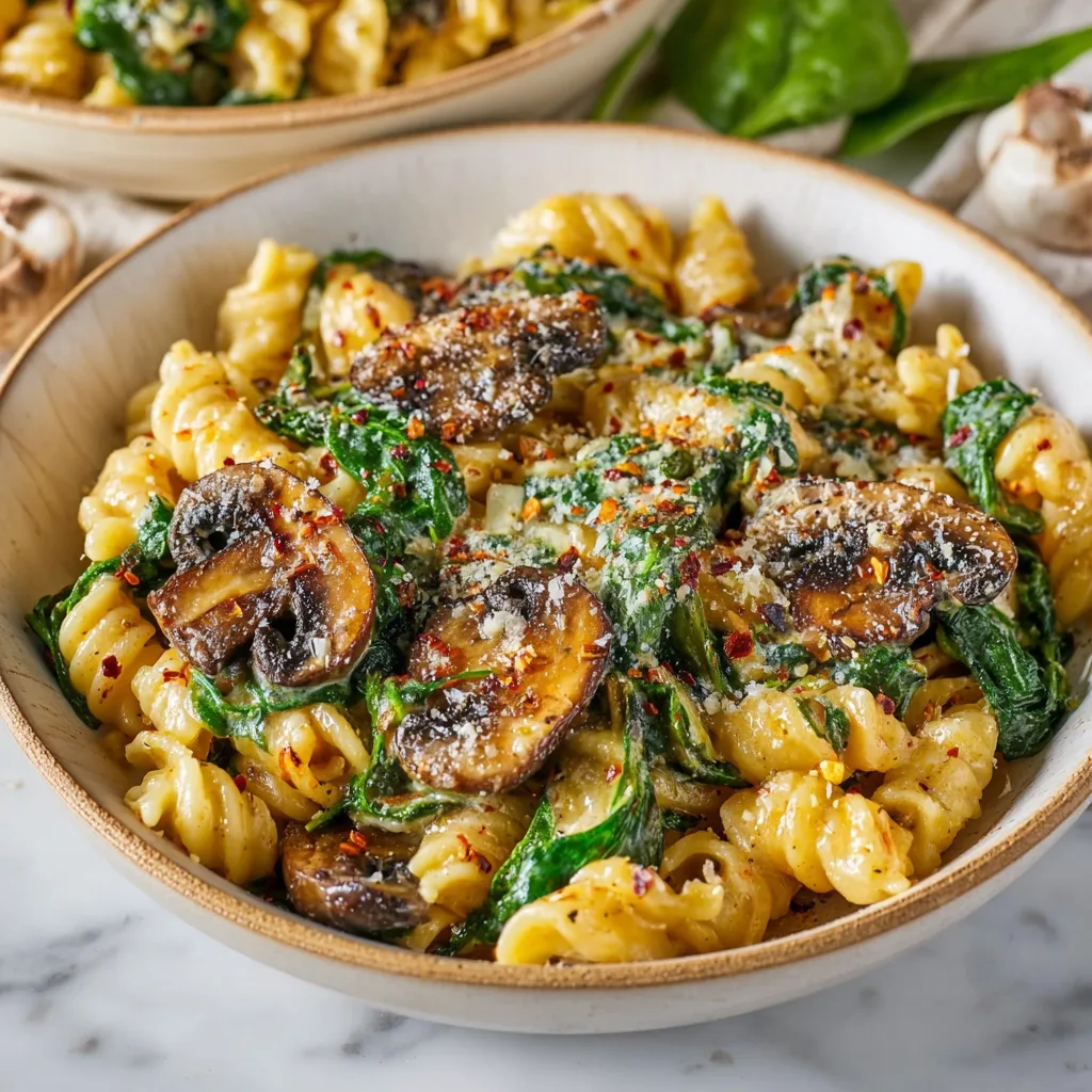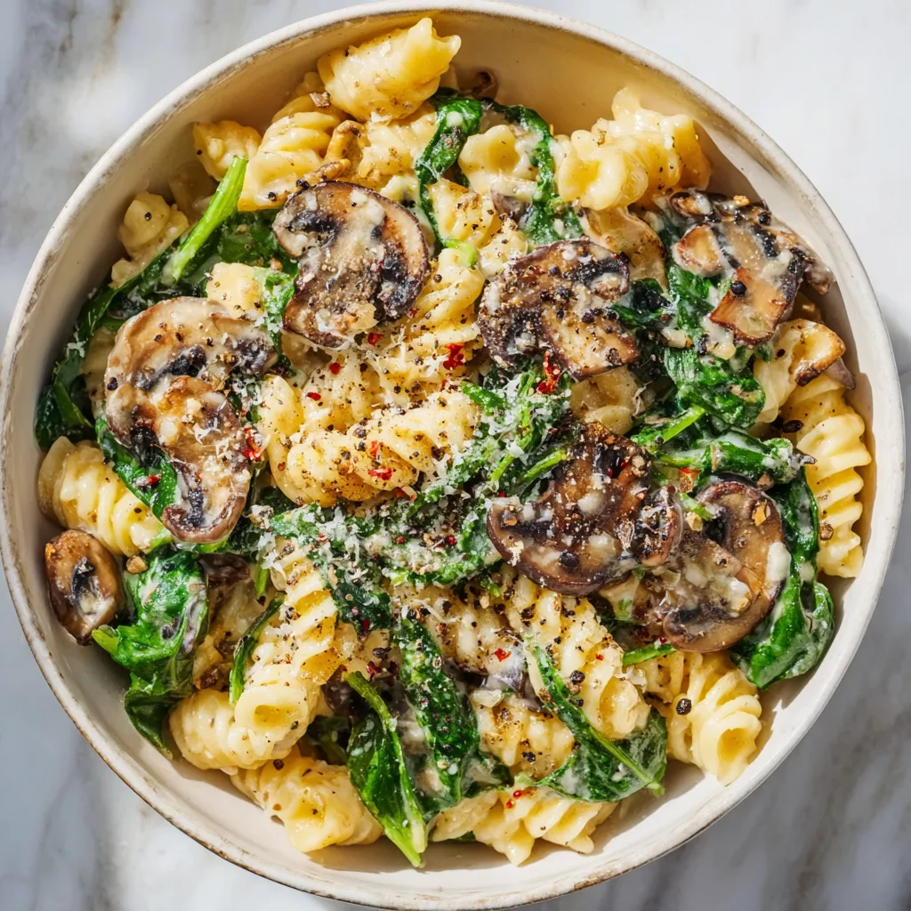 A creamy, cheesy pasta with garlic, mushrooms, and fresh spinach, all made in one pot for a quick and easy dinner.
