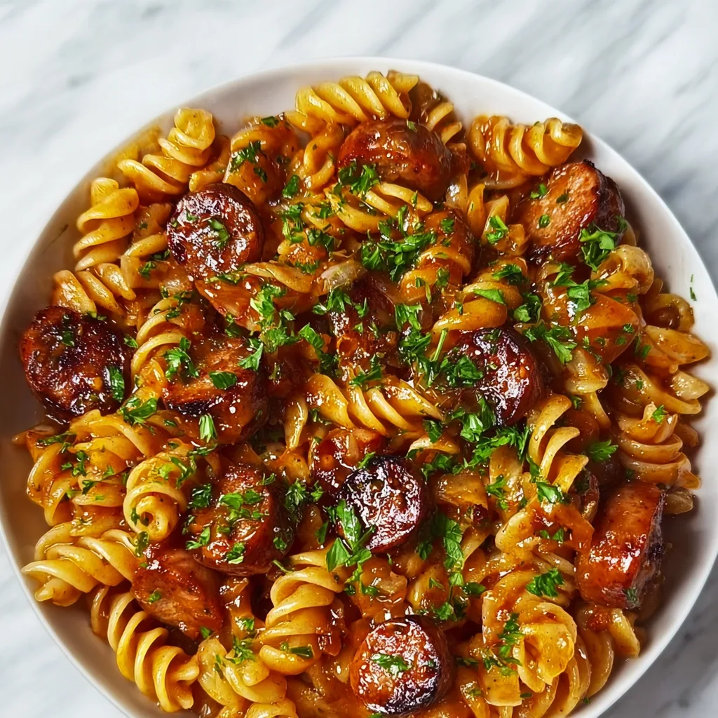 A sweet, smoky, spicy, one-pan pasta dish loaded with sausage, honey BBQ sauce, and tender noodles.