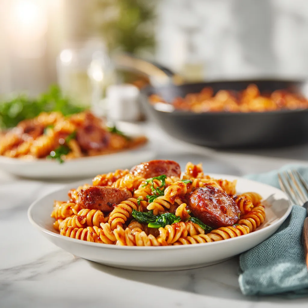 One-Skillet Spicy Honey BBQ Sausage & Pasta