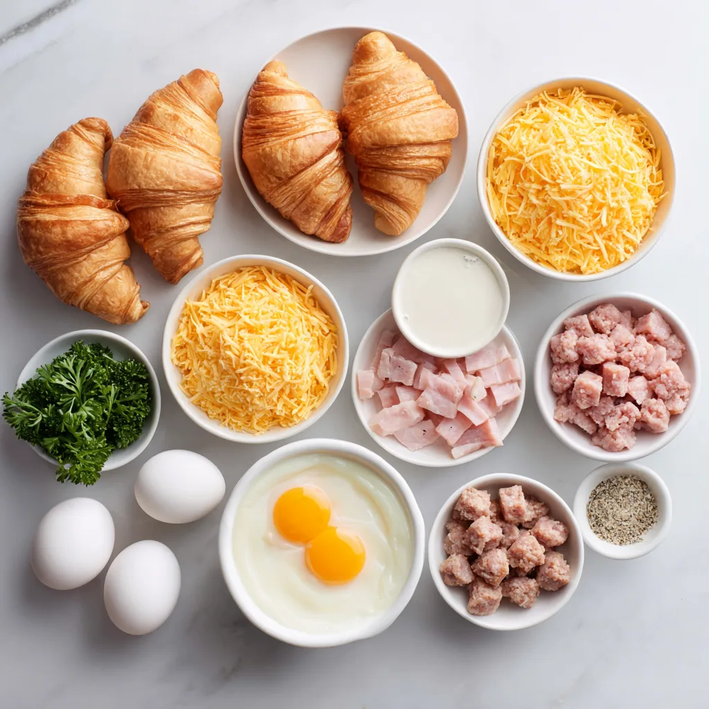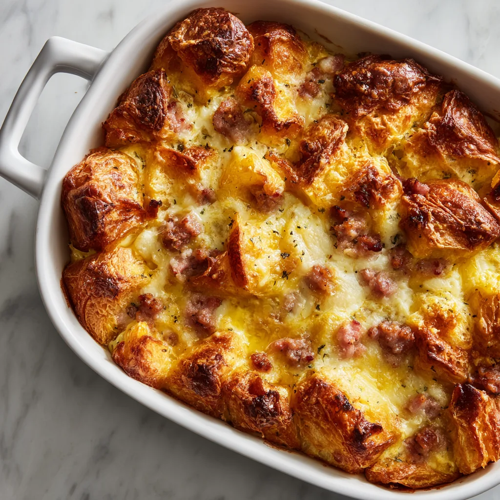 A buttery, cheesy, make-ahead breakfast bake with flaky croissants, sausage, ham, and eggs – perfect for busy mornings or holiday brunch.