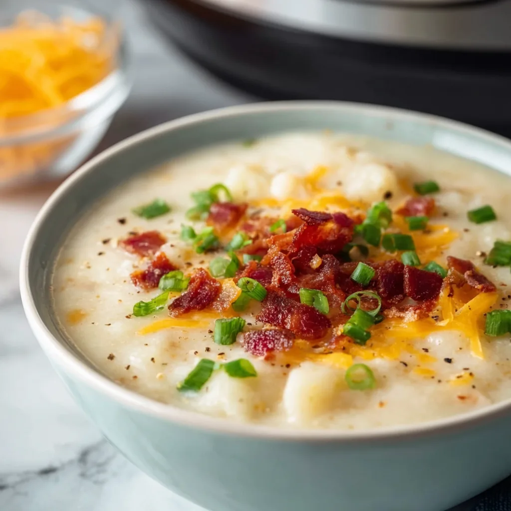 - Ladle soup into bowls and top with extra cheese, crumbled bacon, and green onions.