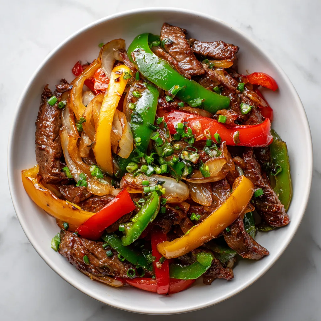 A flavorful stir-fry of tender beef, colorful bell peppers, and onions tossed in a savory soy-based sauce. Quick, vibrant, and perfect for weeknight dinners.