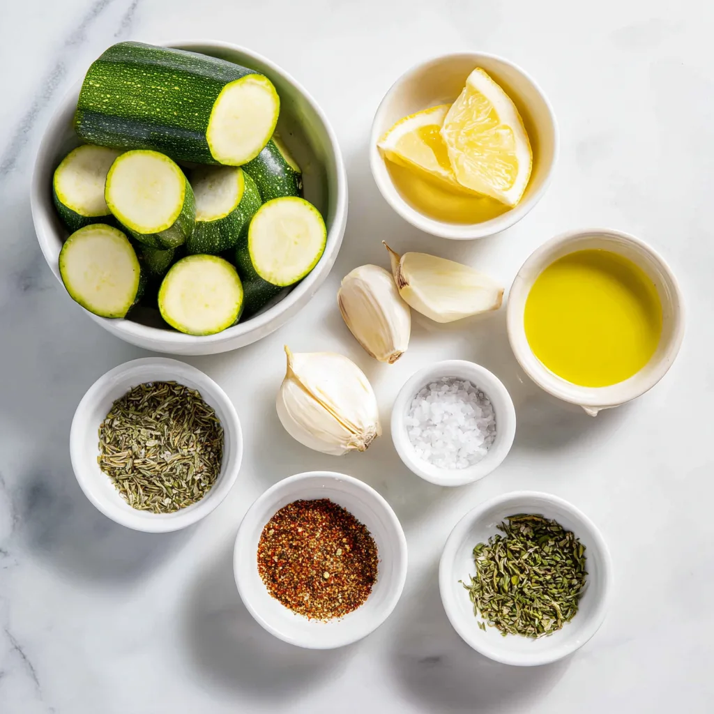 In a medium bowl, combine olive oil, minced garlic, lemon juice, lemon zest, salt, pepper, smoked paprika, oregano, and thyme. Mix well until fully blended. - Coat the zucchini: