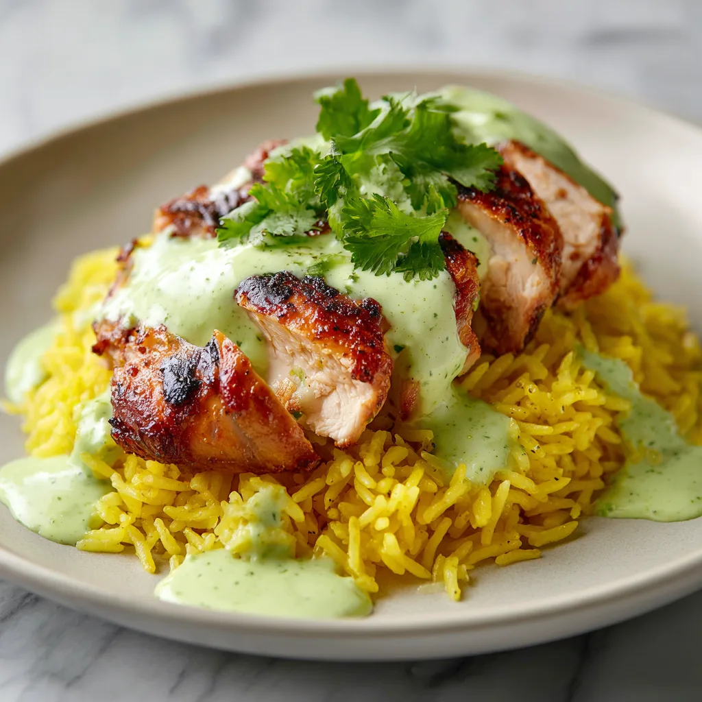 This dish has earned its popularity for good reason. The chicken is marinated in warm spices, garlic, citrus, and herbs, then roasted or pan-cooked until tender with irresistibly crispy edges. The rice absorbs savory juices and aromatics, becoming fluffy yet rich. And then there’s the green sauce—bright, herby, slightly spicy, and creamy enough to drizzle over everything. Once you taste it, you’ll want to put it on more than just chicken and rice.