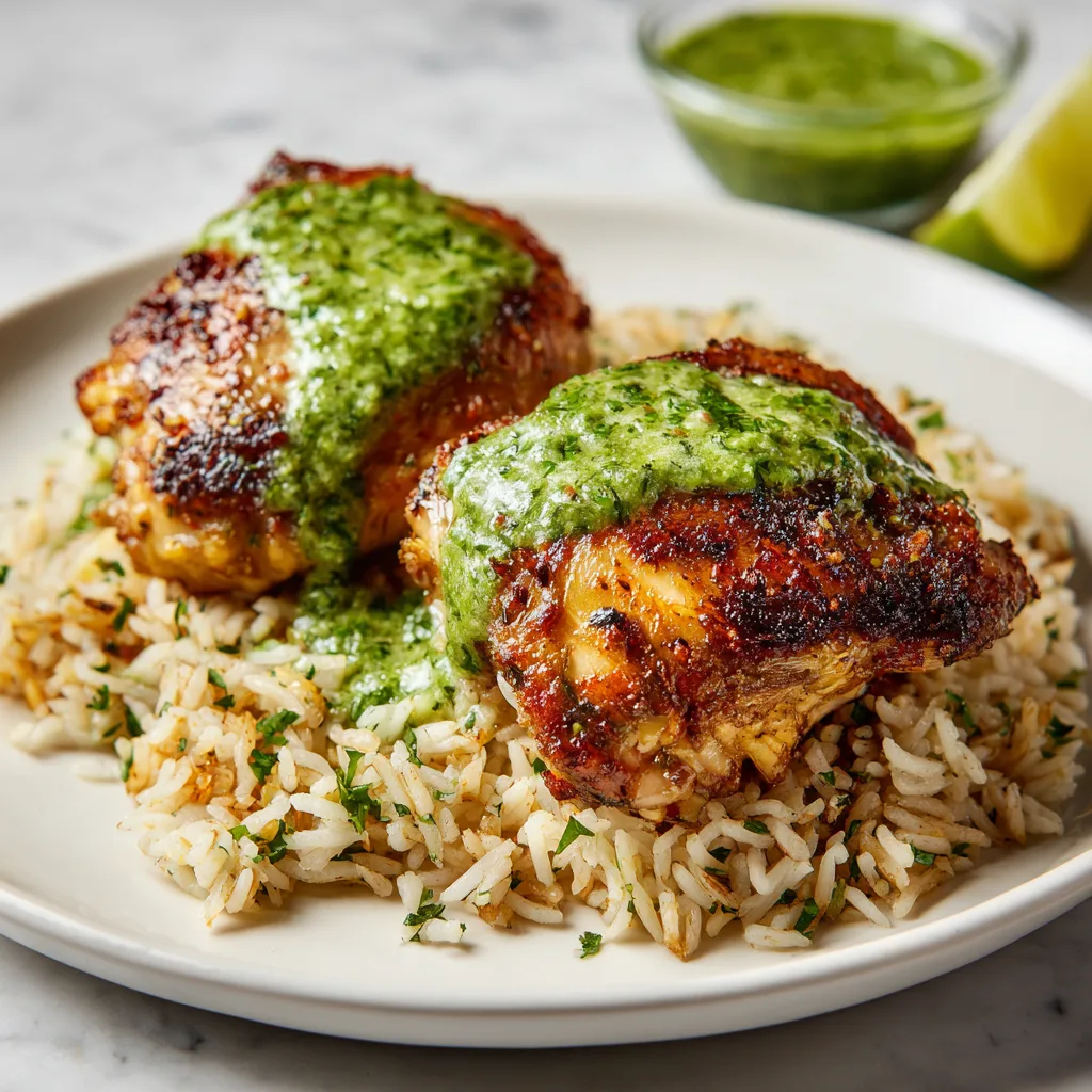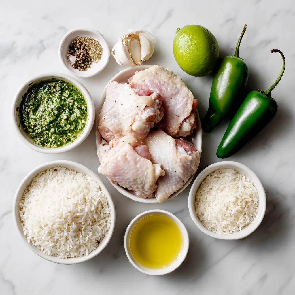 Spoon rice onto plates, top with chicken, and drizzle generously with green sauce. Garnish with fresh cilantro and lime wedges.