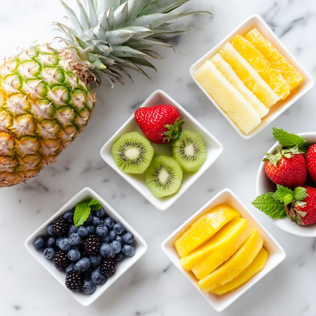 Use colorful fruit slices like kiwi, orange, and mango to mimic tail feathers. Insert them at the back of the pineapple in a fan-like arrangement. - Prepare the Fruits