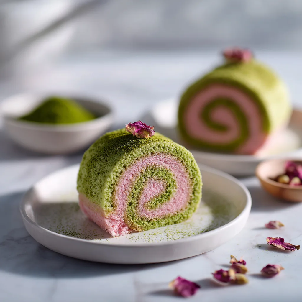 Pink Rose & Matcha Swiss Roll: A Delicate Floral Tea-Time Masterpiece