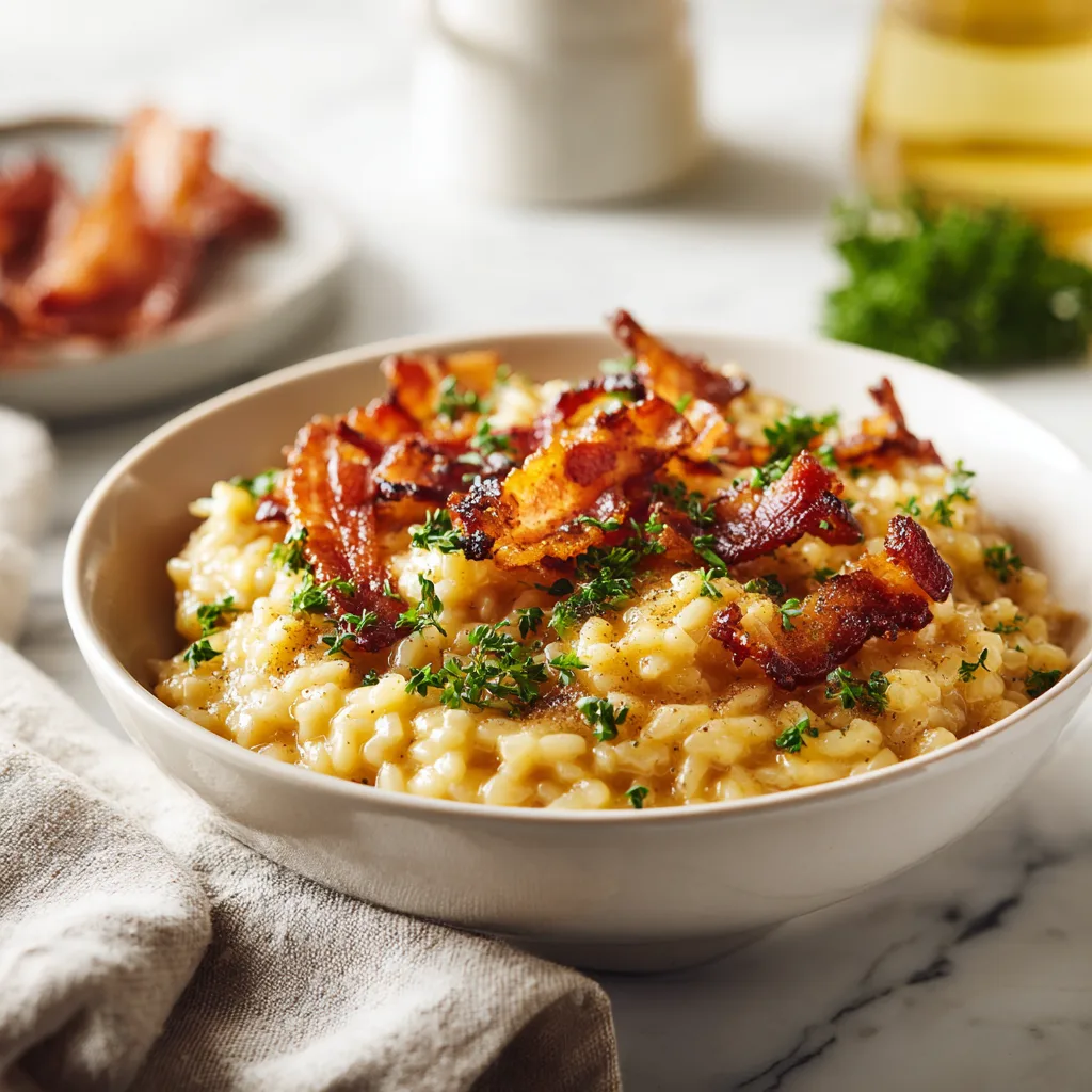 - Serve & garnish: Plate the risotto, top with crispy bacon, a sprinkle of extra Parmesan, and fresh herbs like parsley or sage. Serve immediately.