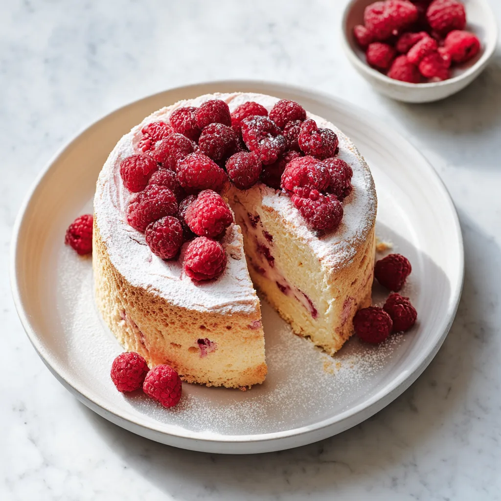 A light, airy angel food cake bursting with fresh raspberries and natural sweetness.