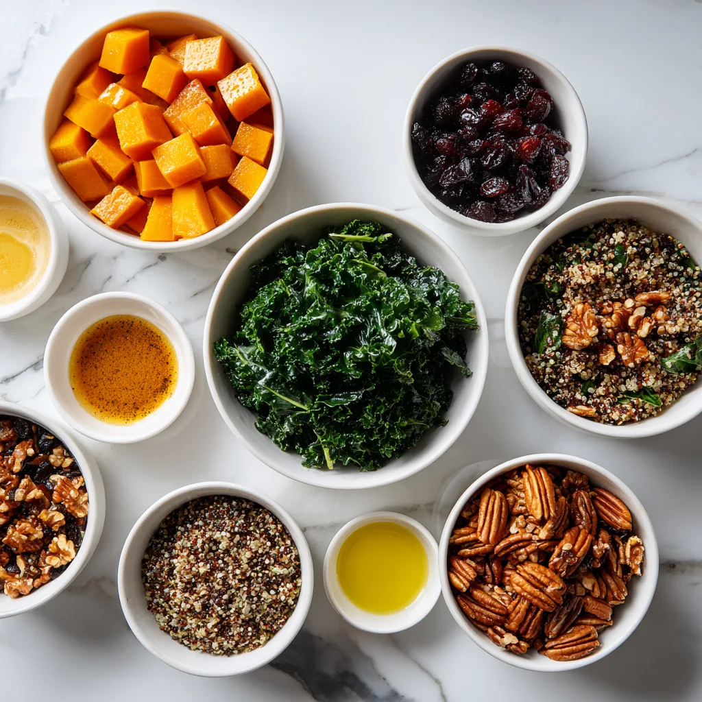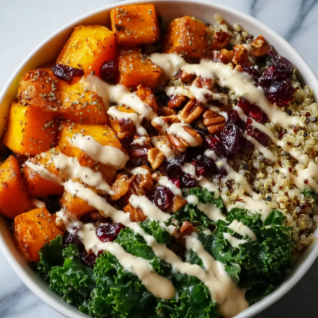 - Assemble bowls with quinoa, squash, kale, cranberries, and pecans.