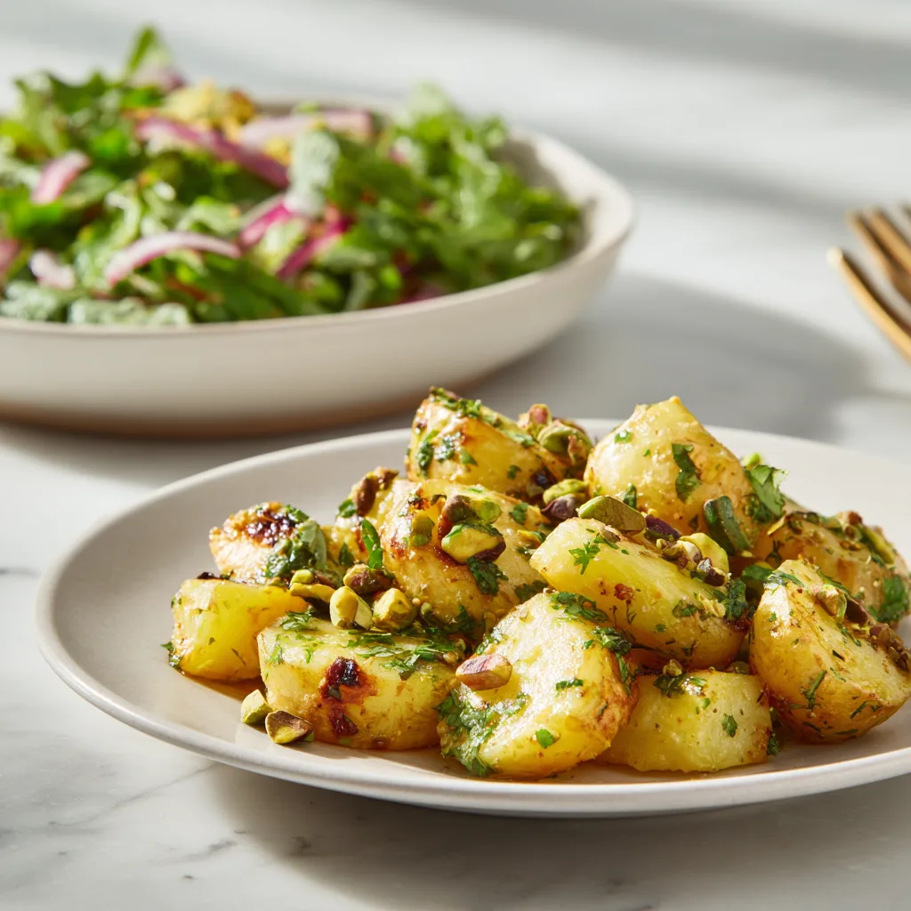 This recipe combines golden roasted potatoes with fragrant herbs, crunchy pistachios, and a light, zesty dressing that balances richness with brightness. The result is a dish that feels indulgent yet fresh, hearty yet vibrant — perfect for gatherings, weeknight dinners, or meal prep.