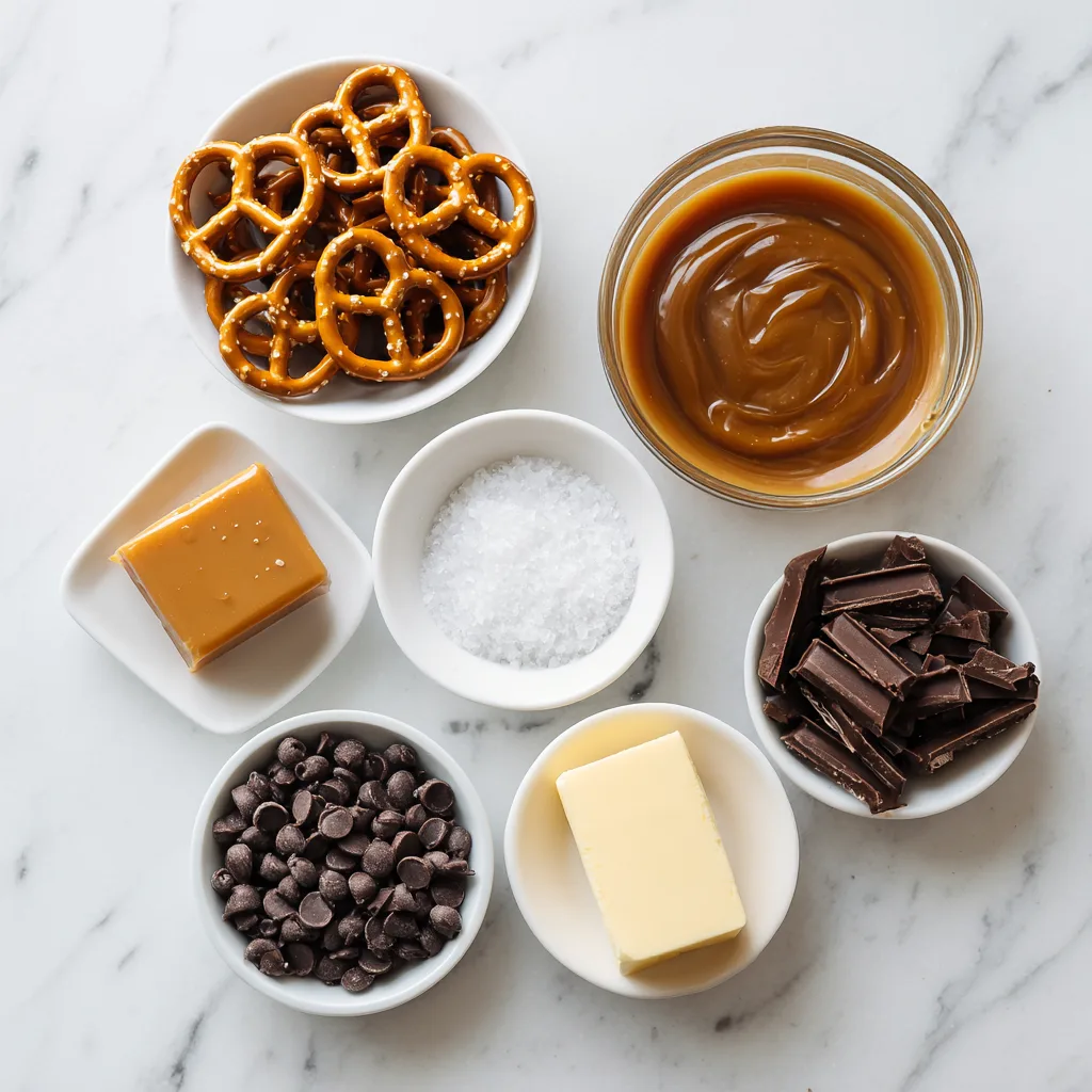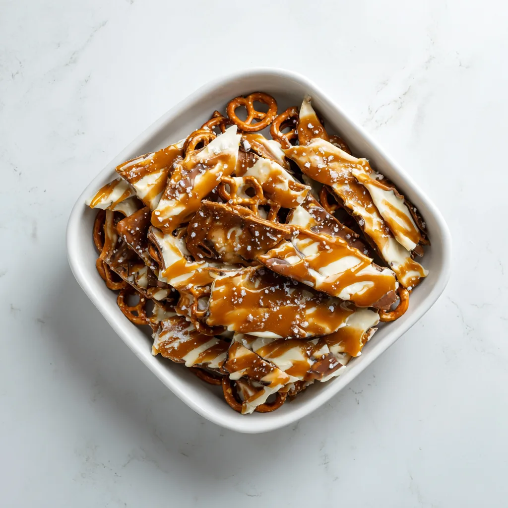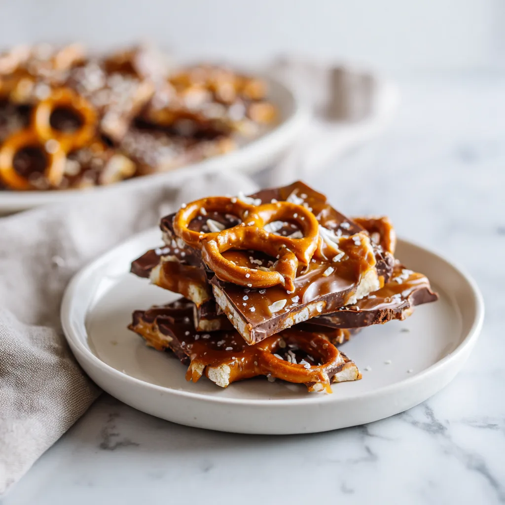 A sweet and salty dessert featuring crunchy pretzels layered with buttery caramel, rich chocolate, and flaky sea salt.