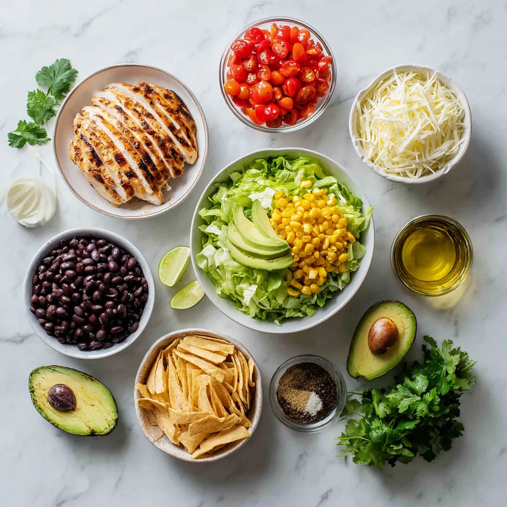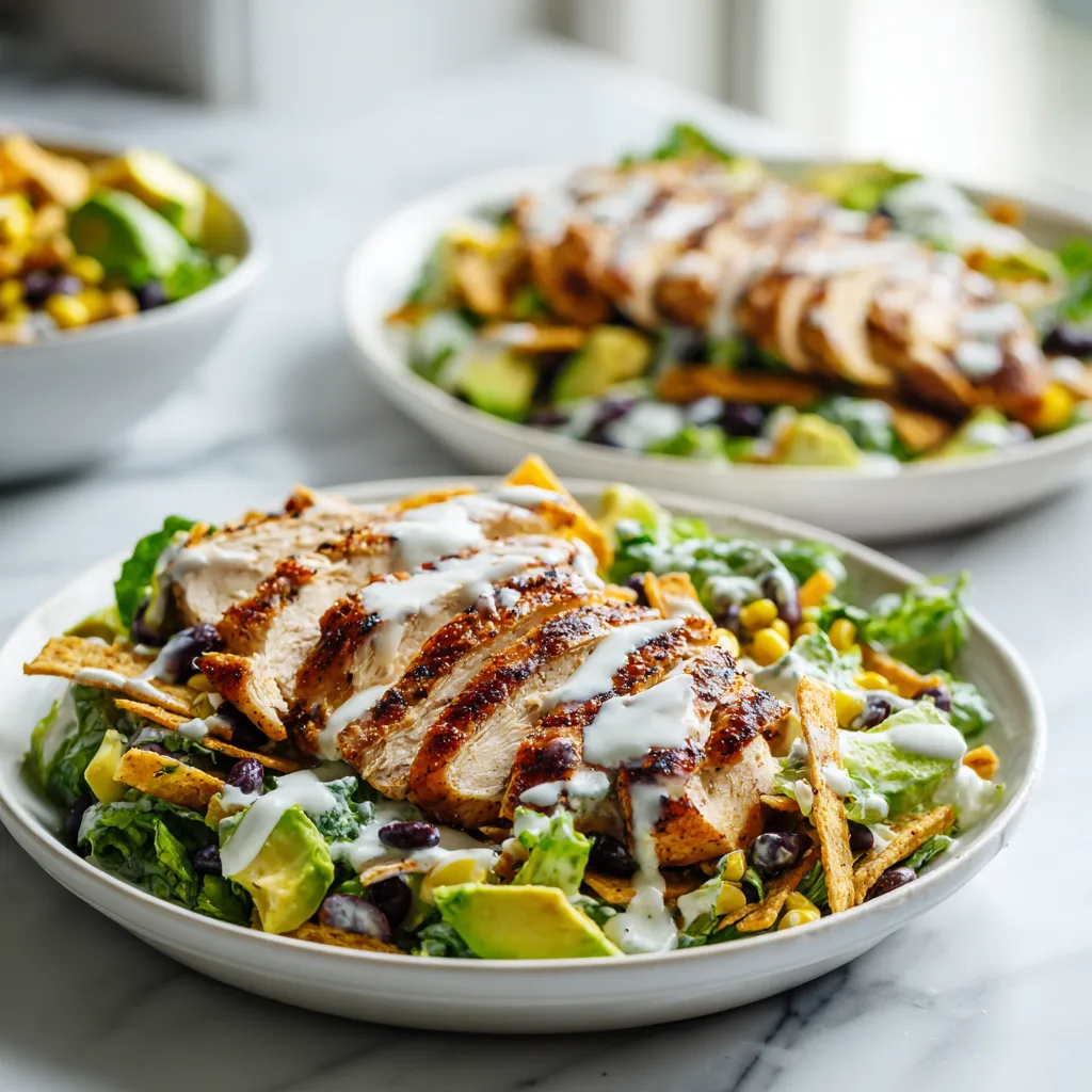 A vibrant Southwest-inspired salad with grilled chicken, black beans, corn, avocado, and a zesty cilantro lime dressing.