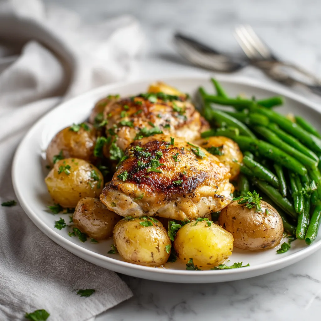 A simple, flavorful one-pan Italian chicken dinner with roasted potatoes and crisp green beans.