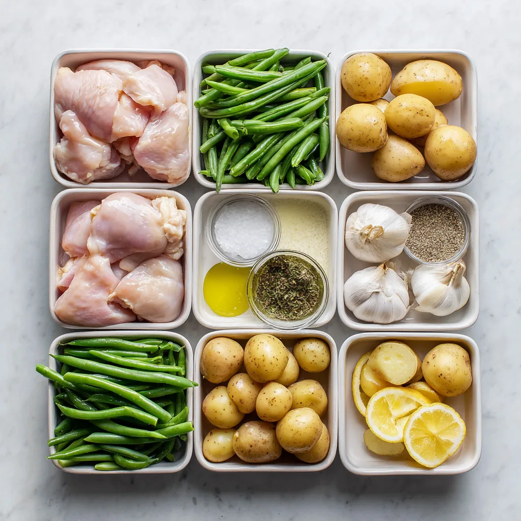 Chicken, potatoes, green beans, olive oil, garlic, and Italian herbs — pantry staples used in the best way.