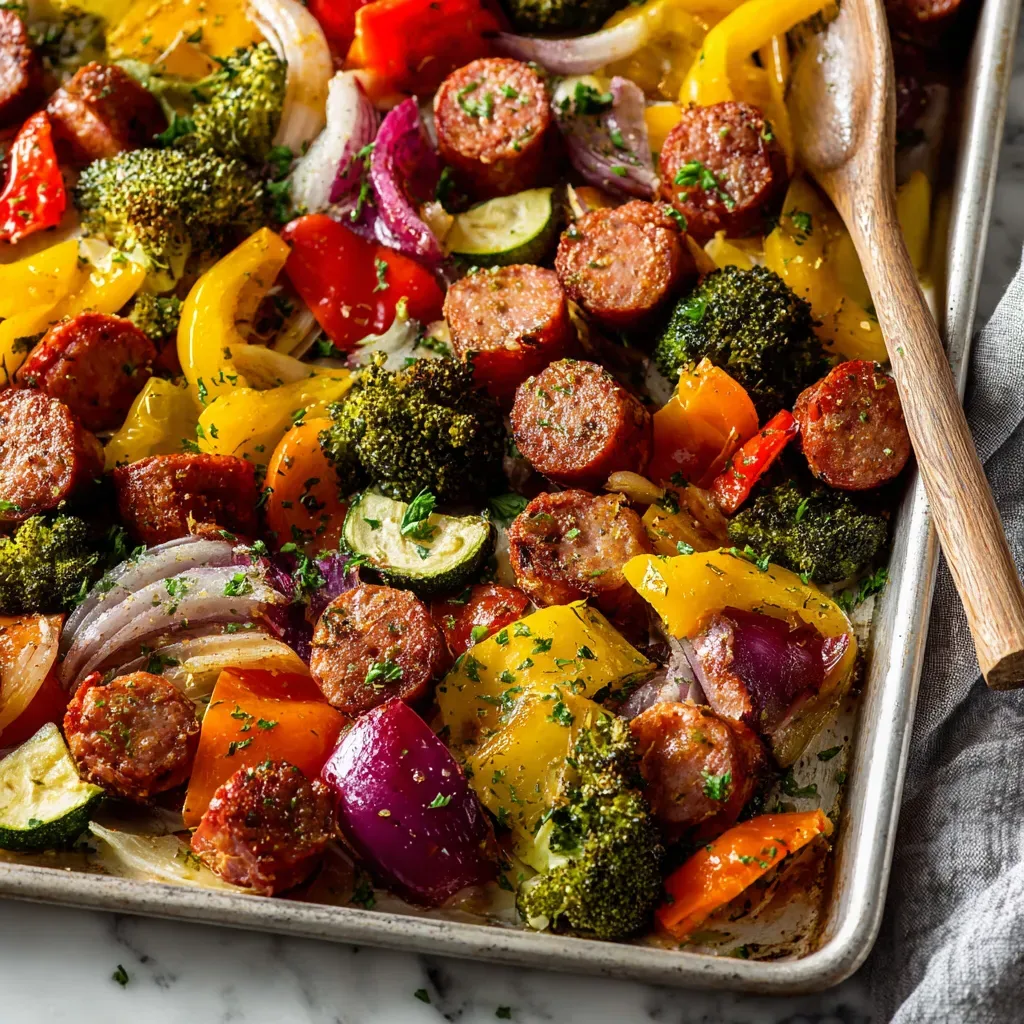 - Bake: Roast in the oven for 20β25 minutes until sausage is cooked through and veggies are tender.