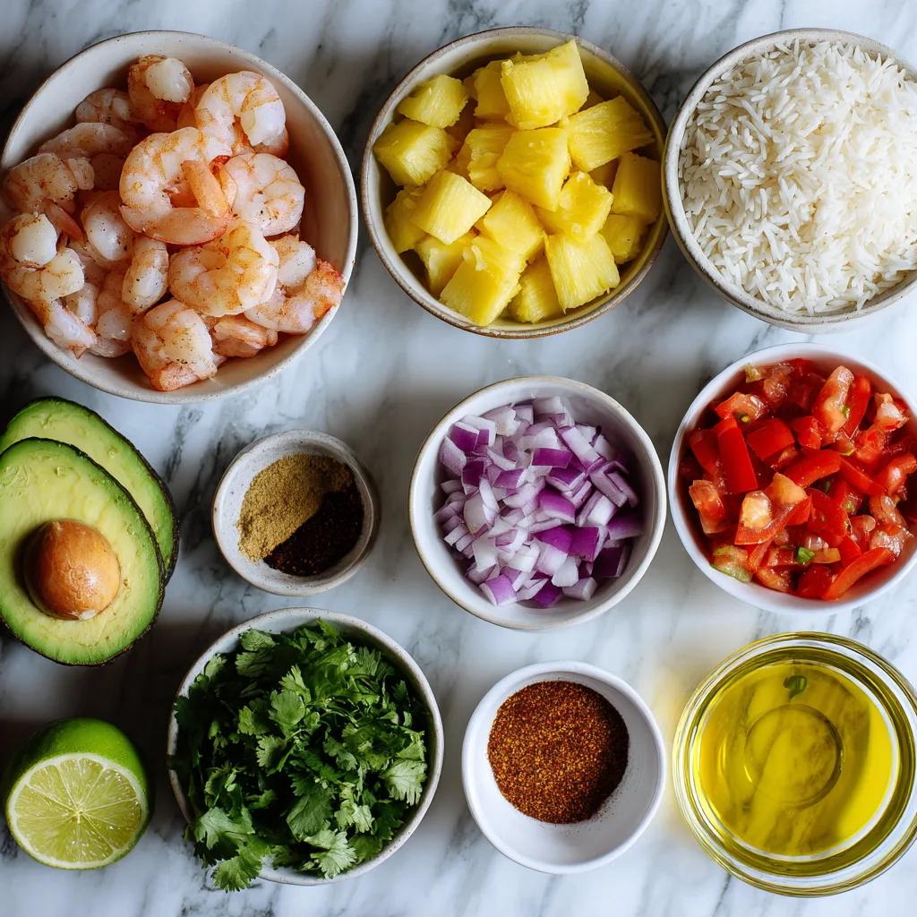 Add a generous scoop of rice as the base of your bowl. Arrange shrimp neatly on top, followed by pineapple salsa, guacamole or avocado slices, and any additional toppings like diced red onion or extra cilantro. Drizzle with a squeeze of lime.