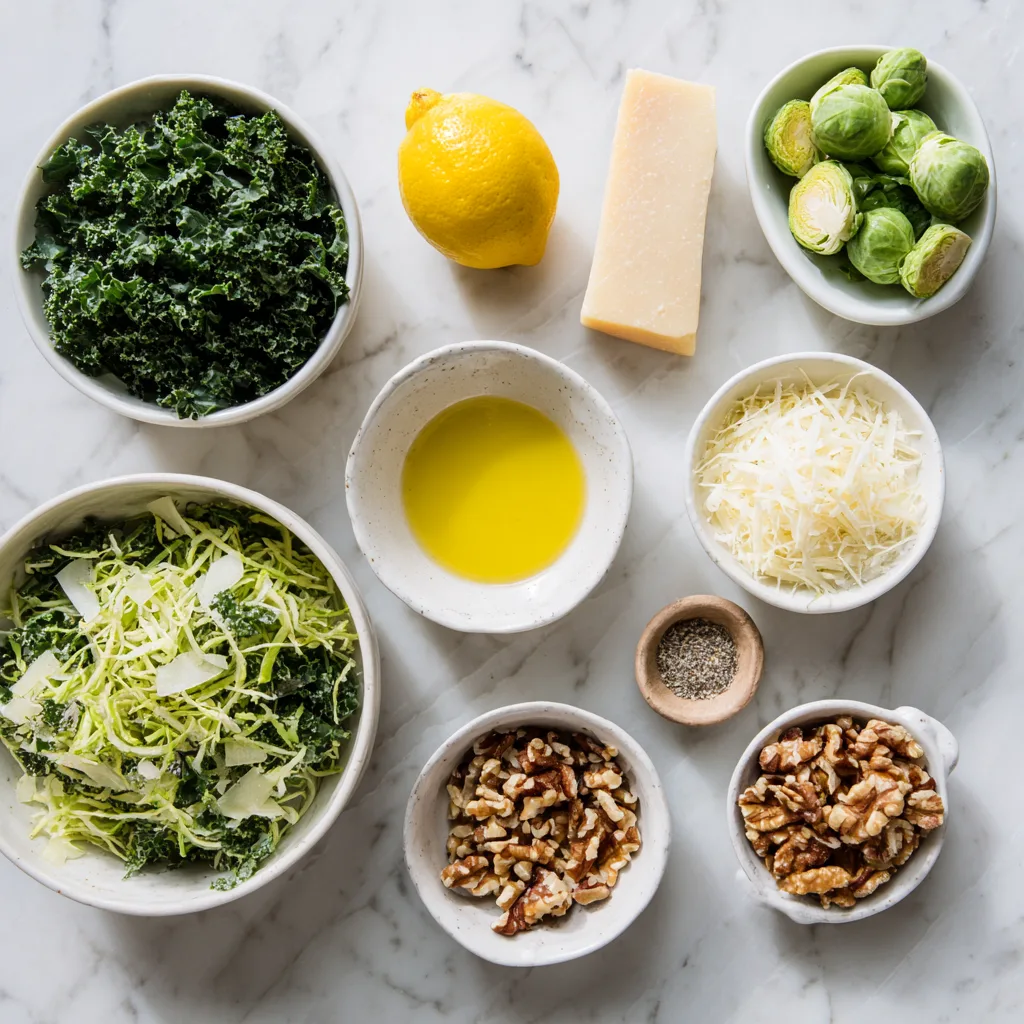 Kale brings a deep, earthy flavor with a slightly bitter edge, while Brussels sprouts offer sweetness and crunch when thinly sliced. Together, they create a base that is robust enough to stand up to bold dressings and toppings. Massaging the kale—a simple technique that softens the leaves—transforms it from tough to tender, making it far more enjoyable to eat.