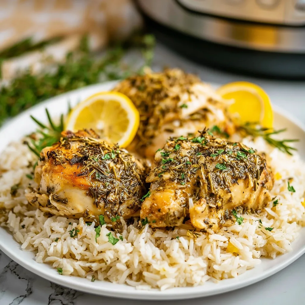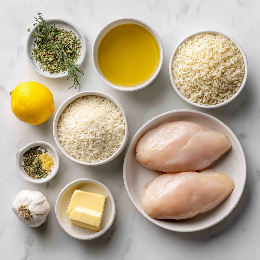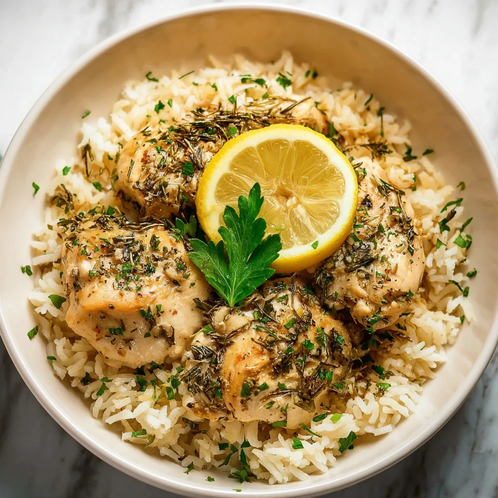 Tender chicken and fluffy rice slow-cooked in a lemon-garlic butter sauce with herbs for a bright, cozy dinner.