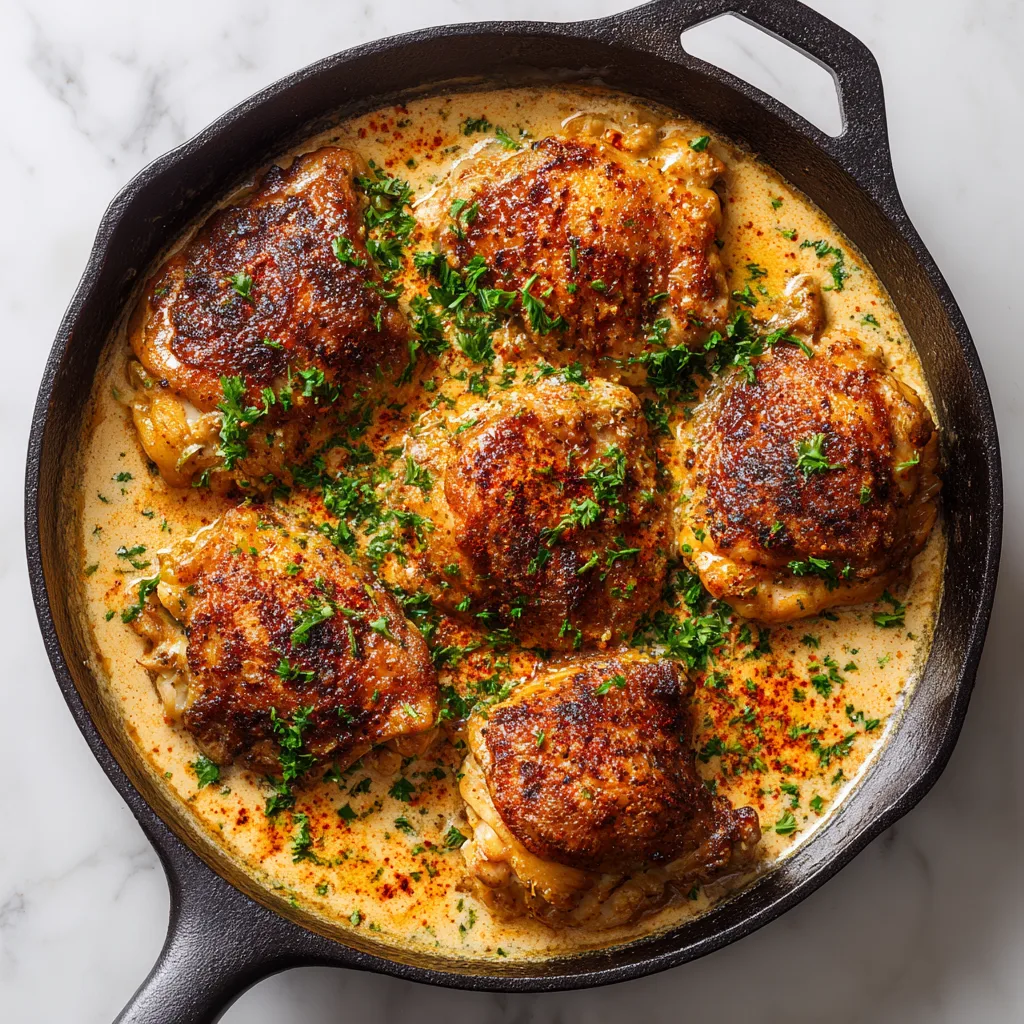 Return seared chicken thighs to the skillet, spooning sauce over each piece. Cover and simmer for 20–25 minutes until chicken is fully cooked and tender. - Garnish and Serve: