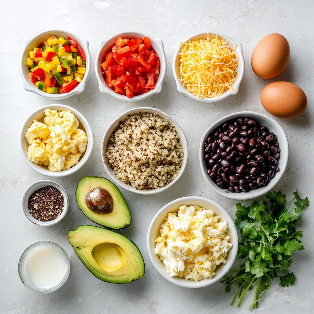 - Assemble bowls with quinoa, sautéed veggies and beans, scrambled eggs, and shredded cheese.