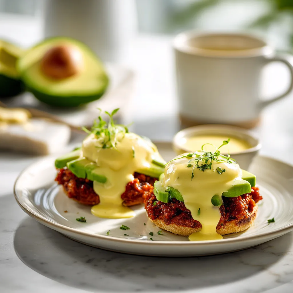 A bold brunch twist on classic eggs benedict featuring crispy chorizo, creamy avocado, poached eggs, and rich homemade hollandaise sauce.
