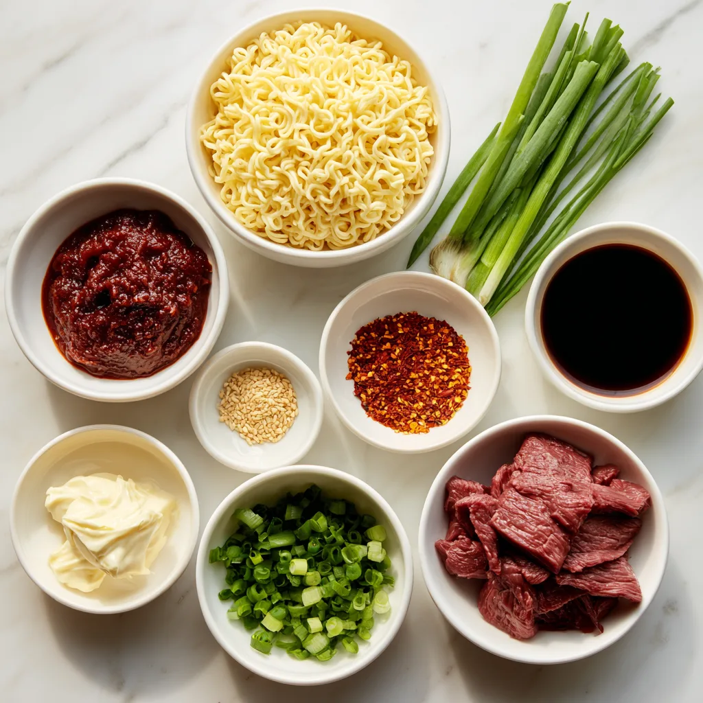 This isn’t your average instant ramen. It’s a full-on flavor explosion featuring a silky creamy gochujang sauce, smoky marinated beef, and springy noodles that soak up every last drop of the spicy goodness.