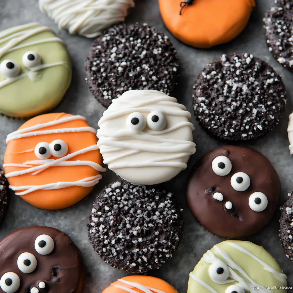 - White Chocolate Ghost Oreos: Dip in white chocolate and add black candy eyes for spooky ghosts.