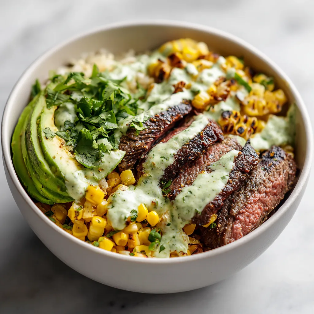 Steak Avocado Roasted Corn Bowl with Cilantro Cream Sauce