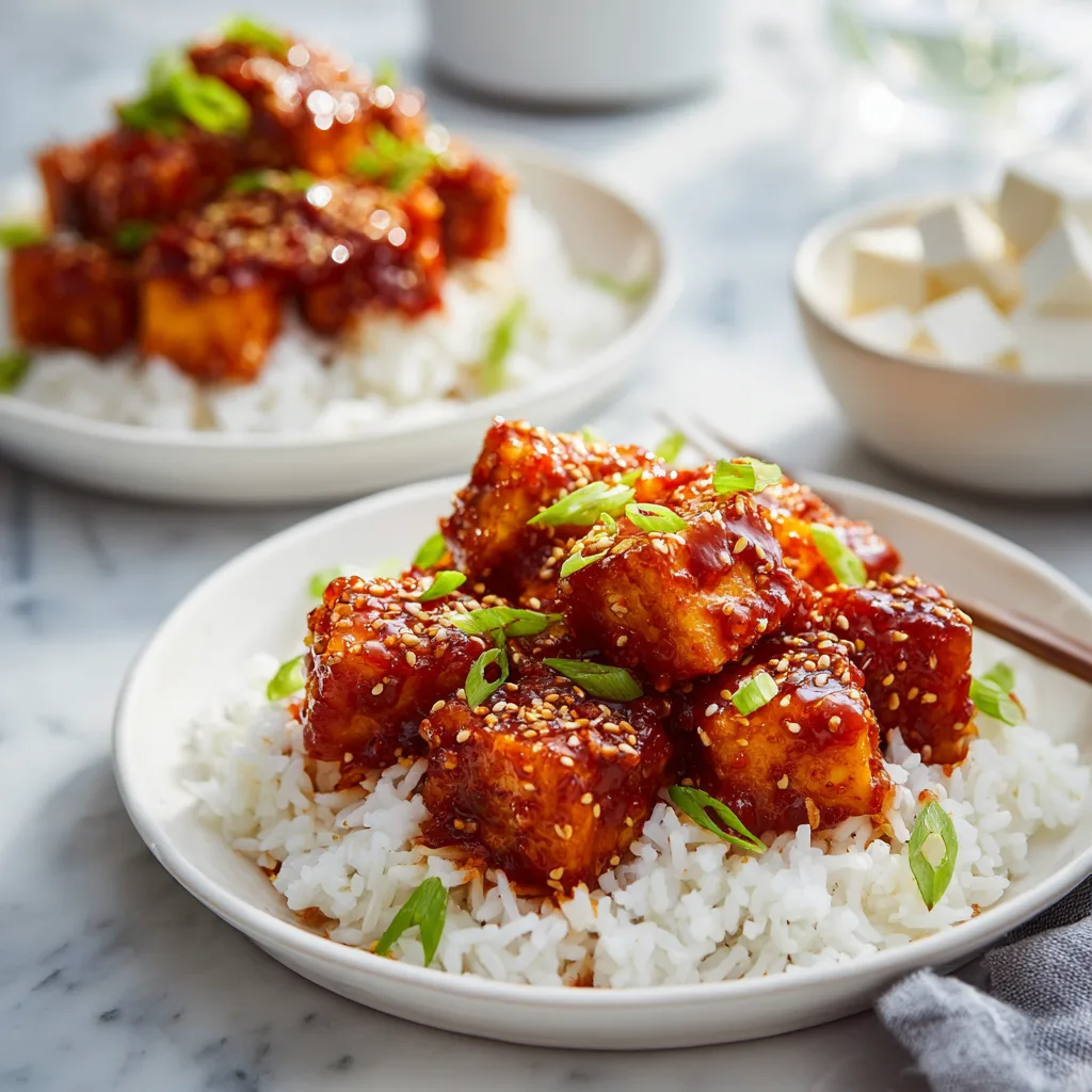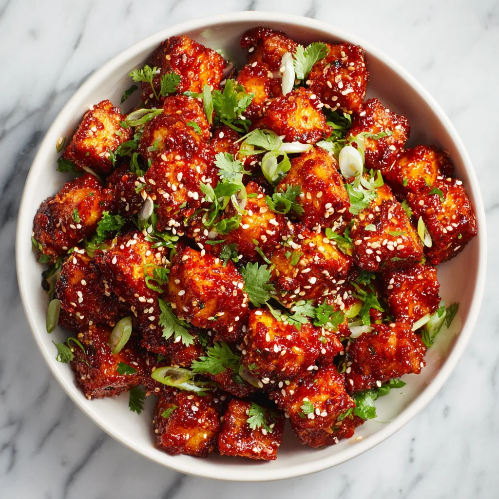 Crispy tofu cubes coated in a sticky, spicy-sweet Korean-inspired gochujang sauce, perfect for a quick vegan dinner.