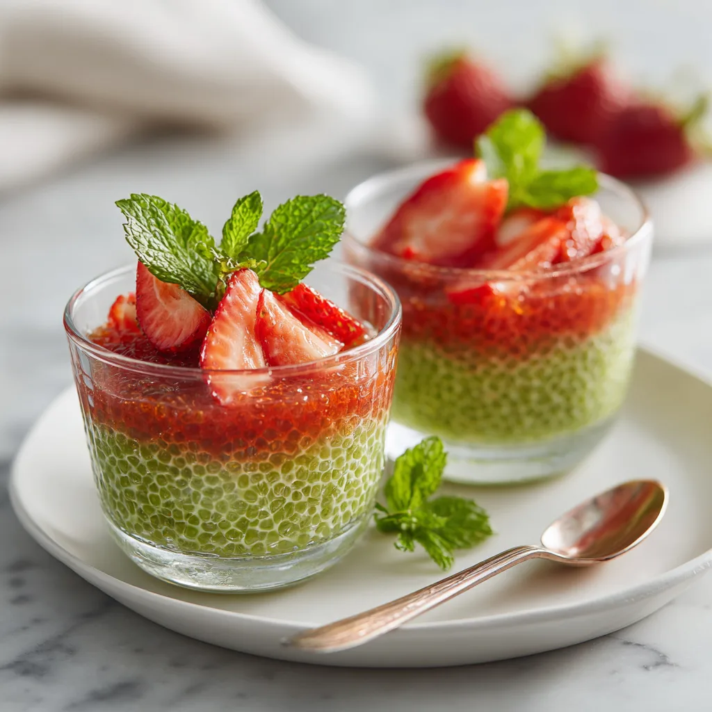 A refreshing Asian-inspired dessert combining chewy sago pearls, creamy matcha coconut base, and fresh strawberries.