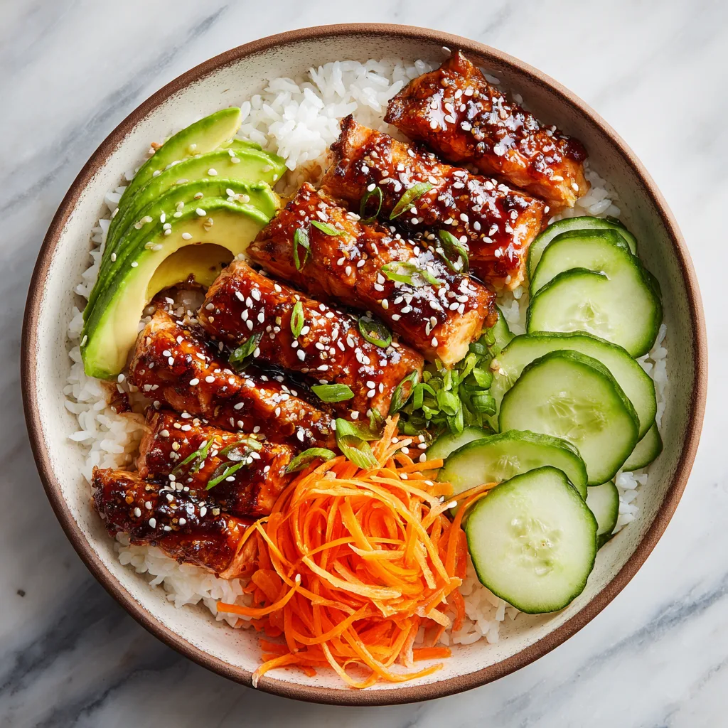 A flavorful and healthy salmon bowl featuring tender glazed salmon, fluffy rice, fresh vegetables, and homemade teriyaki sauce.