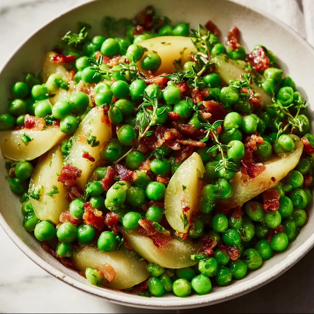 Thanksgiving Peas with Pear and Pancetta might just be your new holiday side obsession. It’s quick, elegant, and perfectly balanced — crisp pancetta for saltiness, caramelized pear for sweetness, and peas for freshness.