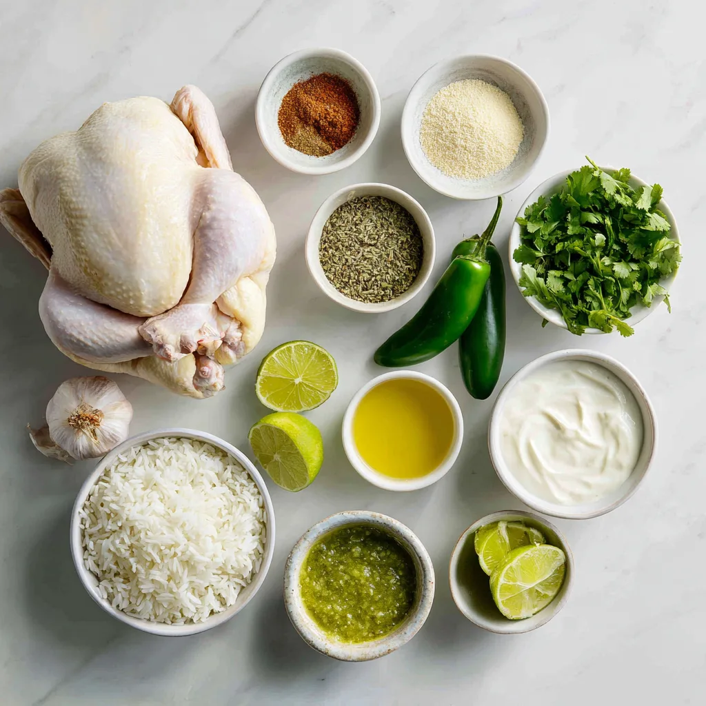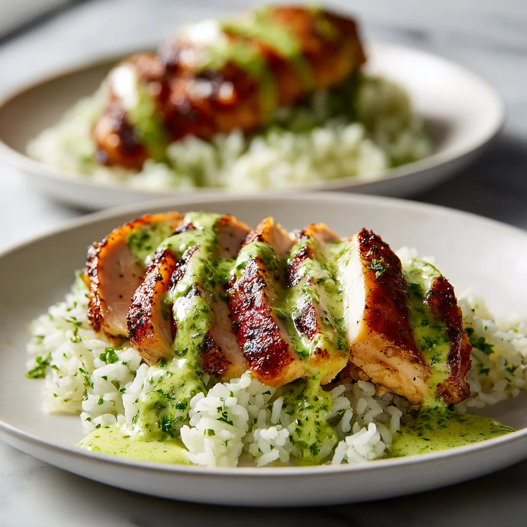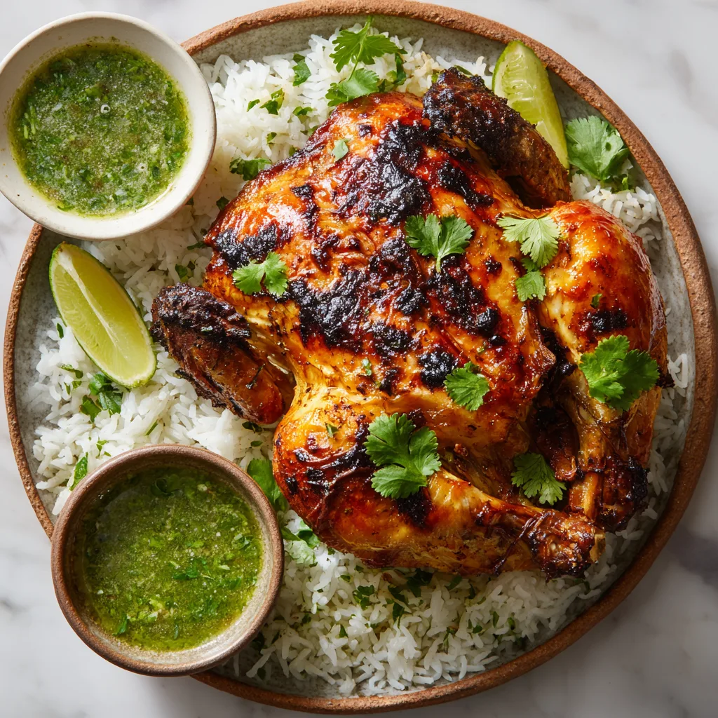 Juicy roasted Peruvian-style chicken served with creamy aji verde sauce and fluffy cilantro-lime rice.