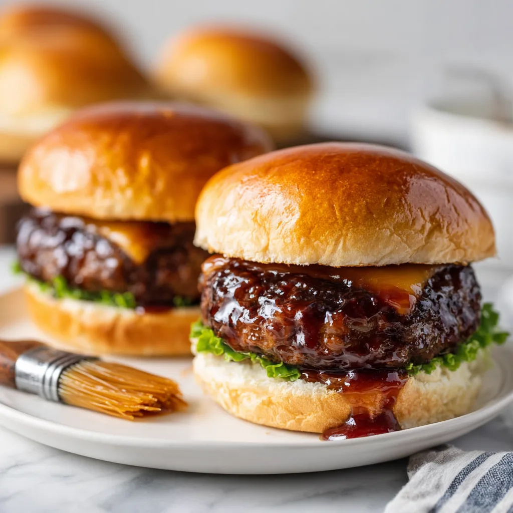 Juicy cheeseburgers coated in a sweet-savory sticky glaze, layered with melted cheddar and toasted brioche buns for an indulgent comfort food experience.