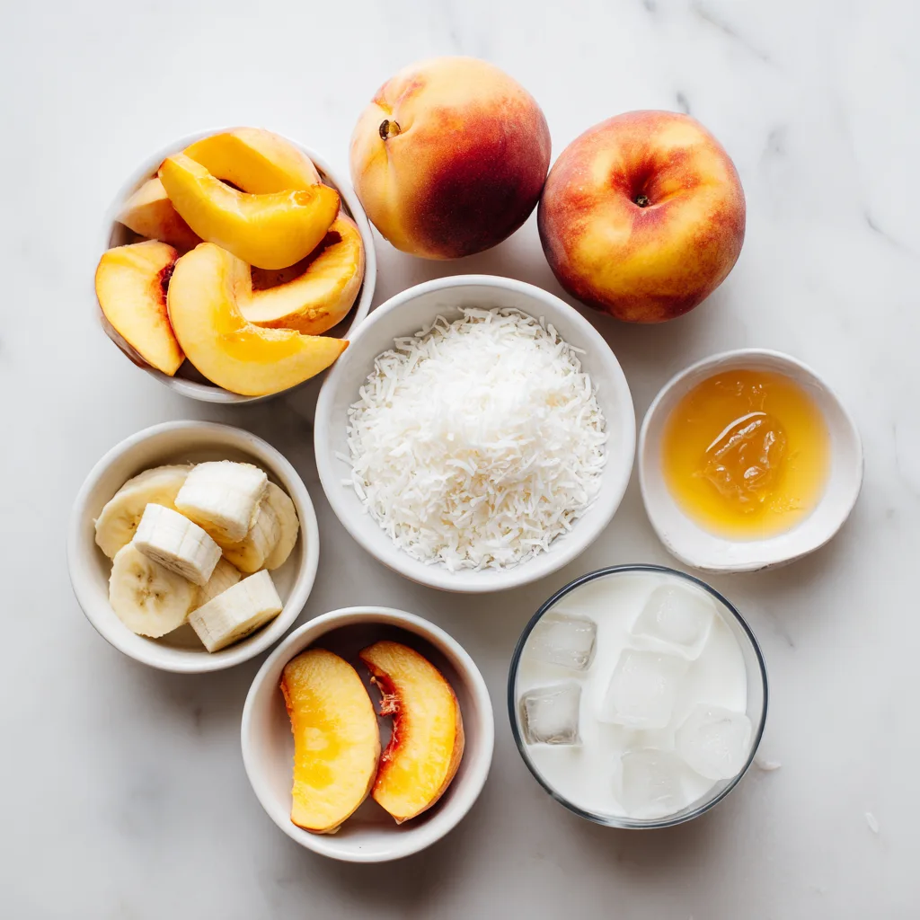 - Pour into chilled glasses and garnish with peach slices or coconut flakes.