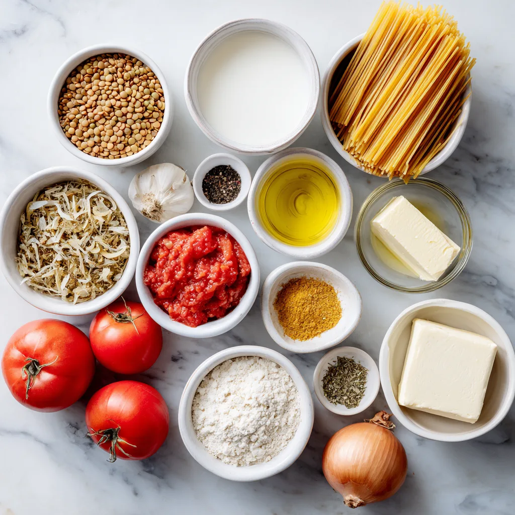 Heat olive oil in a skillet over medium heat. Sauté onions until soft, about 5 minutes. Add garlic and cook another minute. Stir in crushed tomatoes, tomato paste, oregano, cinnamon, nutmeg, salt, and pepper. Simmer 10–12 minutes, then stir in cooked lentils and chopped parsley. Remove from heat. - Cook the Pasta: